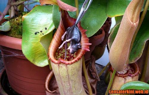 Yang ini juga dikenal sebagai tanaman pitcher tropis atau cangkir monyet, karena ahli zoologi sering melihat monyet yang minum air hujan dari mereka. Tapi untuk keunikan imut ini, Nepenthes sangat berbahaya.