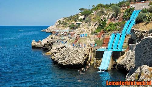 Italia nggak hanya punya bangunan seni, tapi juga wahana seluncuran luar biasa. Namanya adalah Citta del Mare yang terdapat di Sisilia. Berbeda dari kebanyakan seluncuran, yang satu ini bisa membuat kita mengalami petualangan seru. Bagamana tidak, ujung dari seluncurannya sendiri bukanlah kolam melainkan laut Mediterania. Seperti gambar berikut bentuknya.