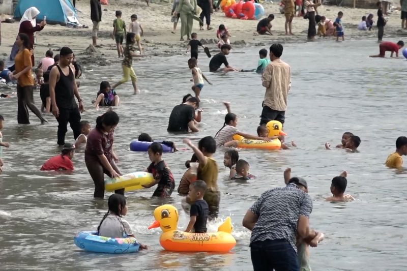 ANTARA – Sebanyak 57.000 warga Jakarta dan sekitarnya memadati kawasan Pantai Lagoon, kawasan Ancol, Jakarta di hari ketiga lebaran, Jum’at (12/4). Guyuran hujan di kawasan itu tak menurunkan minat para orang tua dan anak-anak untuk menghabiskan waktu dengan bermain, berenang, serta bersantai menikmati suasana pantai.  (Azhfar Muhammad Robbani/Aria Cindyara/Satrio Giri Marwanto/Rijalul Vikry)