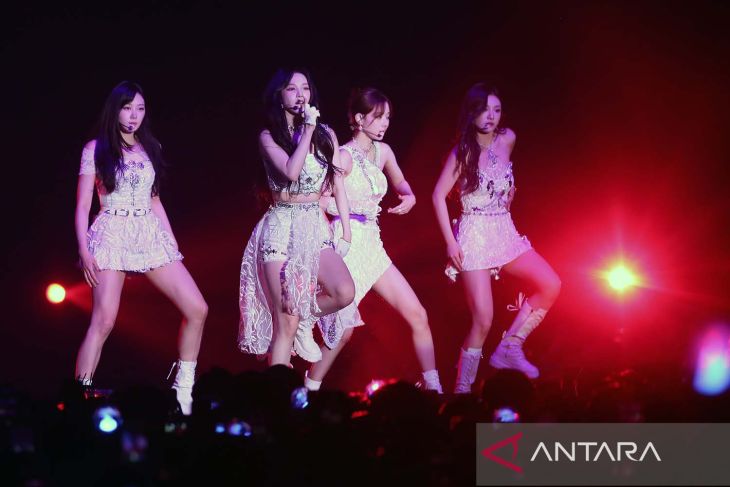 Grup band asal Korea Selatan aespa tampil di hadapan penggemarnya saat konser di Indonesia Convention Exhibition (ICE), Kabupaten Tangerang, Banten, Sabtu (24/6/2023). Grup band yang beranggotakan Karina, Giselle, Winter, dan NingNing tersebut menggelar konser pertamanya di Indonesia. ANTARA FOTO/Muhammad Iqbal/aww.