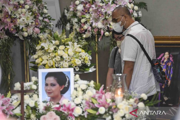 Pelayat berdiri di samping peti jenazah aktris Rima Melati di Rumah Duka Rumah Sakit Pusat Angkatan Darat (RSPAD) Gatot Soebroto, Jakarta, Jumat (24/6/2022). Aktris senior Rima Melati meninggal dunia pada Kamis (23/6) di usia 84 tahun setelah mendapatkan perawatan beberapa hari di RSPAD Gatot Soebroto, Jakarta. ANTARA FOTO/M Risyal Hidayat/wsj.