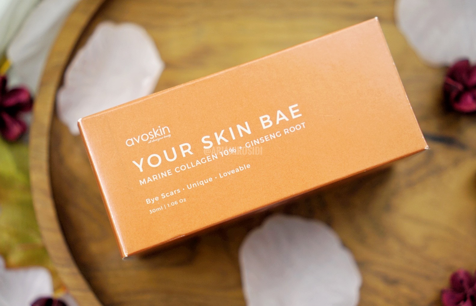 Avoskin Your Skin Bae Marine Collagen 10% +Ginseng Root ini datang dengan kotak yang informatif berwarna orange kecokelatan. Di bagian depannya terdapat tulisan Avoskin Your Skin Bae Marine Collagen 10% + Ginseng Root, di sisi lainnya lagi terdapat informasi manfaat, cara pakai, ingredients, PAO 12 bulan, logo vegan, dan cruelty free.
