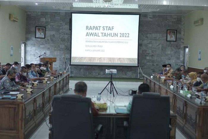 Baturaja, BP–Plh Bupati OKU Edward Candra didampingi Sekretaris Daerah OKU Achmad Tarmizi, memimpin Rapat Awal Tahun bersama Kepala Organisasi Perangkat Daerah (OPD) Pemkab OKU Tahun 2022, bertempat di Ruang Abdi Praja Pemkab OKU. Kamis, (6/1/2022).