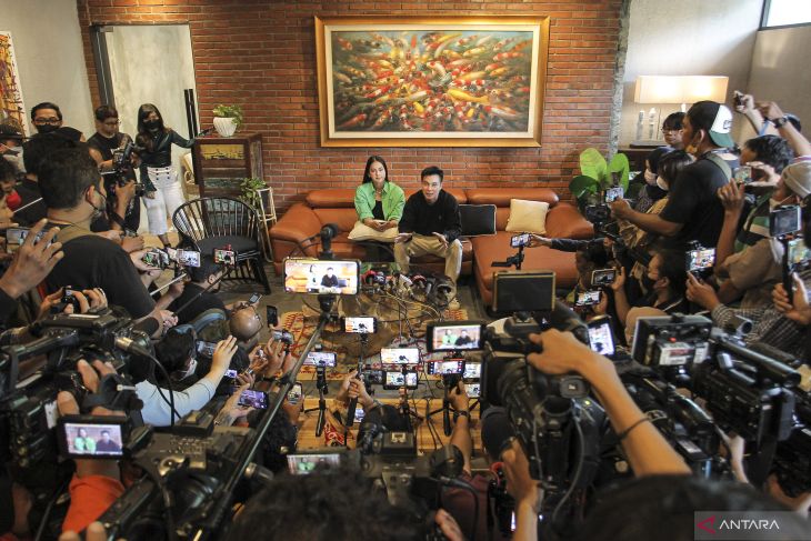 Aktor Baim Wong (kanan) bersama istrinya Paula Verhoeven (kiri) menyampaikan keterangan pers terkait polemik Citayam Fashion Week di kawasan Tanah Kusir, Jakarta, Selasa (26/7/2022). Dalam kesempatan tersebut Baim Wong resmi mencabut pendaftaran Hak Kekayaan Intelektual (HAKI) atas Citayam Fashion Week di Kementerian Hukum dan HAM. ANTARA FOTO/Dhemas Reviyanto/foc.