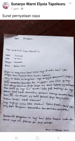 “Saya Sunaryo usia 30 tahun menyampaikan permintaan maaf kepada Pemkab Mentawai, terkhusus kepada Camat Siberut Barat dan relawan atas status saya yang tidak pada tempatnya. Saya berjanji tidak akan membuat pernyataan yang merugikan pemerintah dan meresahkan masyarakat,” tulisnya.