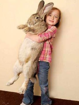 Alice nama sang pemilik kerepotan menggendong kelinci yang besarnya hampir sama dengannya,ukuran hewan kelinci paling besar didunia milik Alice begitu mengagumkan super duper besarnya berukuran 130 cm 20 cm lagi mencapai 1,5 meter,mampu melahap 3 kg wortel dan 1 kg Apel 2 kg kubis dan rumput dalam 1 hari.