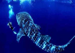 Hiu paus raksasa <Rhincodon typus> hidup di air laut samudera hindia yang ukuran sirip atasnya seukuran manusia seperti terlihat dalam gambar namun makanannya adalah planton yang ada di dalam laut jenis hewan ini telah diyakini berasal 600 juta tahun lalu.