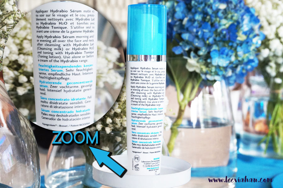 Puterin tsay bagian belakangnya…Nah pada bagian badan belakang kemasan bisa kita lihat, deskripsi kandungan Bioderma Hydrabio Serum ini juga ada, enggak hanya di dusnya tapi bagian kemasan si serum itu sendiri juga ada.
