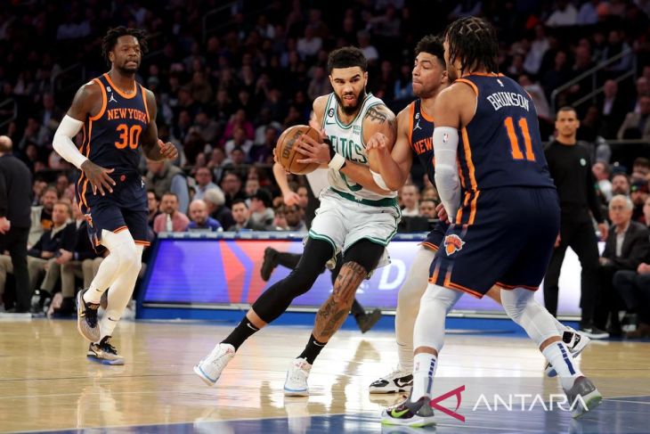 Pebasket Boston Celtics Jayson Tatum (0) berupaya melewati pebasket New York Knicks Quentin Grimes (6) dan Jalen Brunson (11) dalam pertandingan NBA di Madison Square Garden, New York, AS (27/2/2023). ANTARA FOTO/Brad Penner-USA TODAY Sports via Reuters/tom.