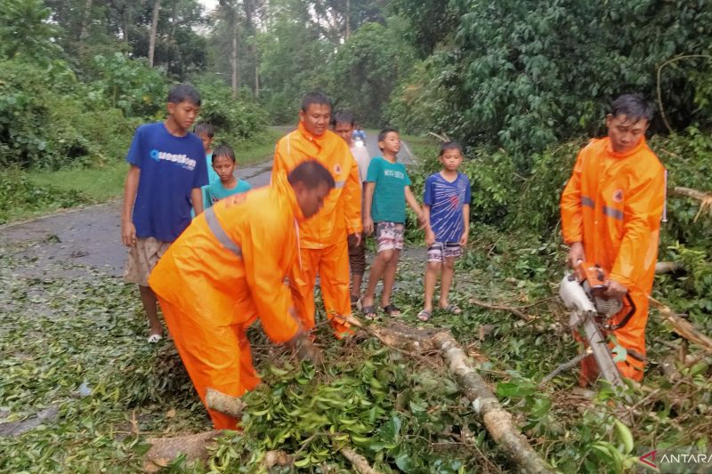 Muaradua (ANTARA) – Personel Badan Penanggulangan Bencana Daerah (BPBD) Kabupaten Ogan Komering Ulu (OKU) Selatan, Sumatra Selatan membersihkan material pohon tumbang akibat ditiup angin kencang agar arus lalu lintas kembali lancar.