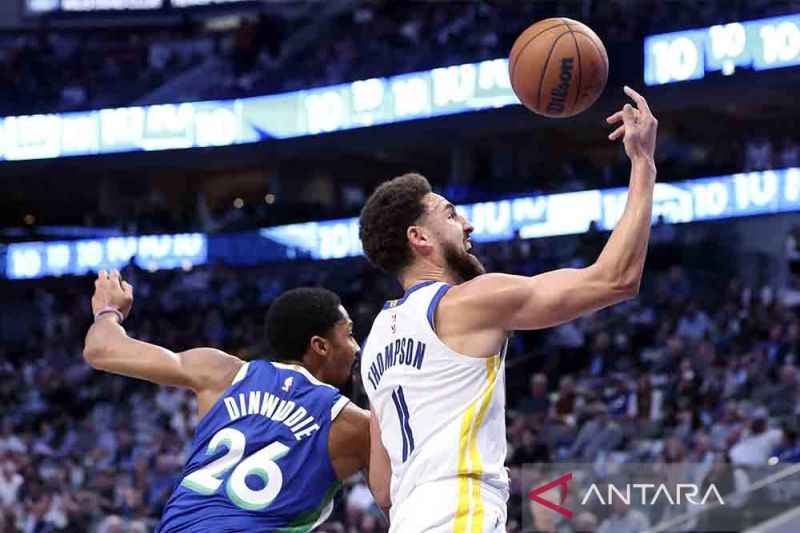 Pebasket Golden State Warriors Klay Thompson kehilangan bola saat berhadapan dengan pebasket Dallas Mavericks Spencer Dinwiddie pada babak reguler NBA 2022 di American Airlines Center, Dallas, Texas, Amerika Serikat, Selasa (29/11/2022). Dallas Mavericks menang atas Golden State Warriors 116-113. ANTARA FOTO/Kevin Jairaj-USA TODAY Sports/rwa.