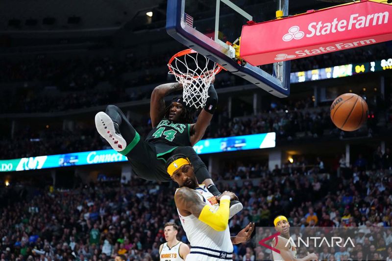 Pebasket Boston Celtics Robert Williams III (44) melakukan slam dunk saat pertandingan NBA melawan Denver Nuggets di Ball Arena, Denver, Colorado, AS (1/1/2023). Denver Nuggets berhasil mengalahkan Boston Celtics dengan skor 123-111. ANTARA FOTO/ Ron Chenoy-USA TODAY Sports/aww.