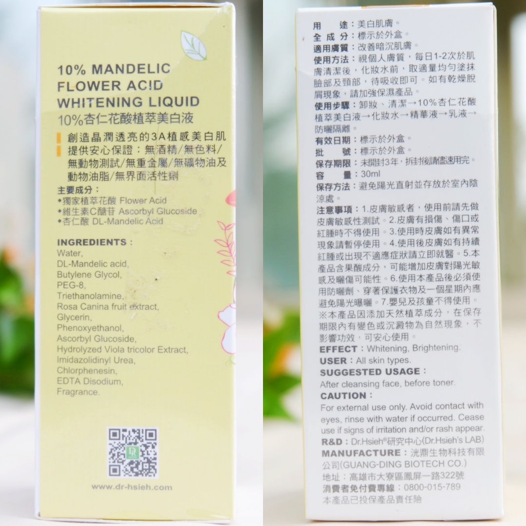 Kemasan Dr.Hsieh 10% Mandelic Flower Acid Whitening Liquid terbalut dalam box putih dipadu kuning ke jingga-jinggaan *wkwk bahasa apa ini* dan disetiap sisi kemasan dusnya juga sama ada detail produk dengan tulisan bahasa Mandarin Taiwan dan inggris.