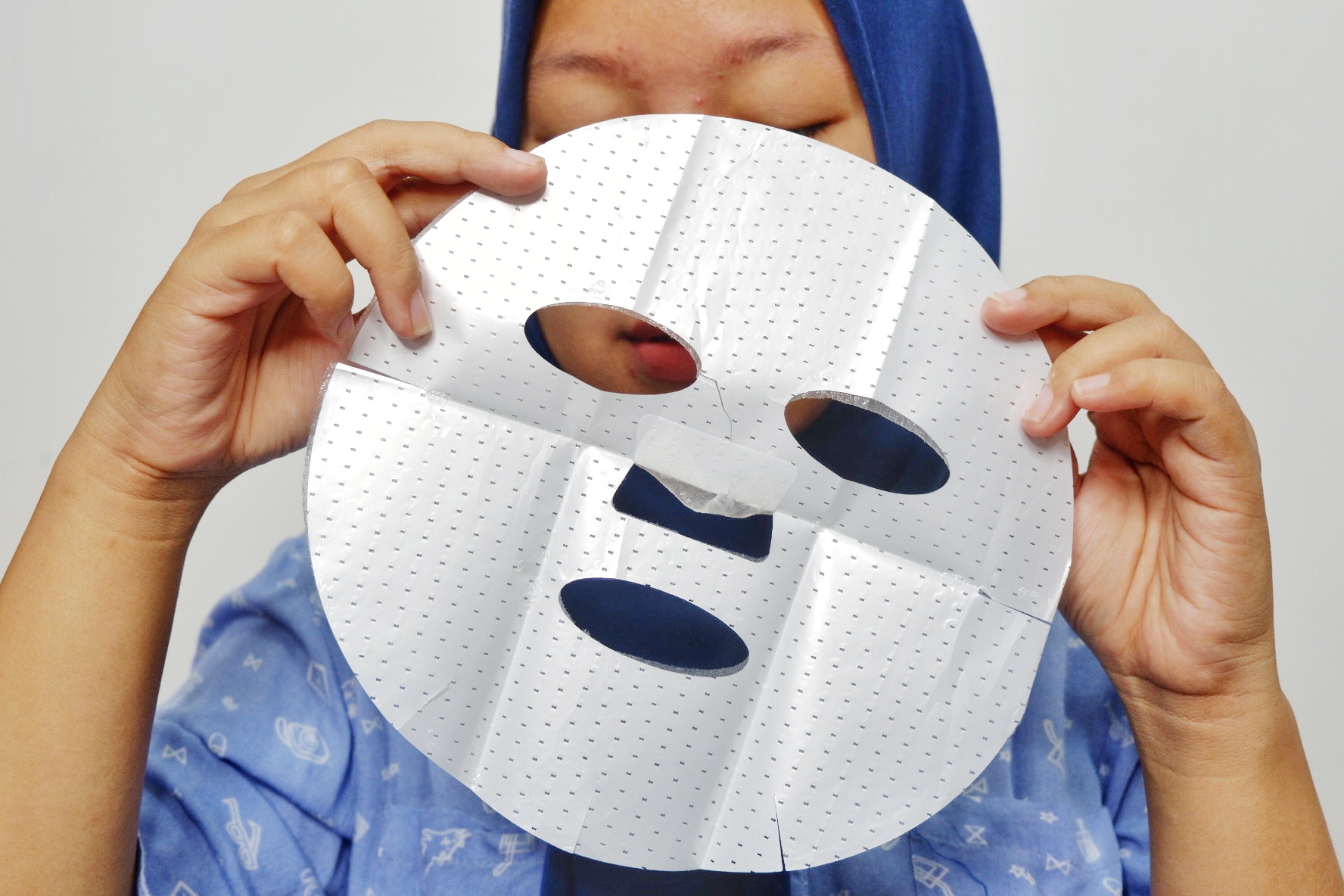 Nah lembaran sheet mask ini dilapisi plastik putih yang nyatu dengan lembaran maskernya. Untuk ngemudahin pas pemasangan sheet mask di wajah lebih rapi.