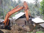 Membersihkan timbunan tanah menimpa kedua rumah tersebut, H Mukhlis Amd selaku Direktur PT Takabeya Perkasa Group datangkan alat berat.