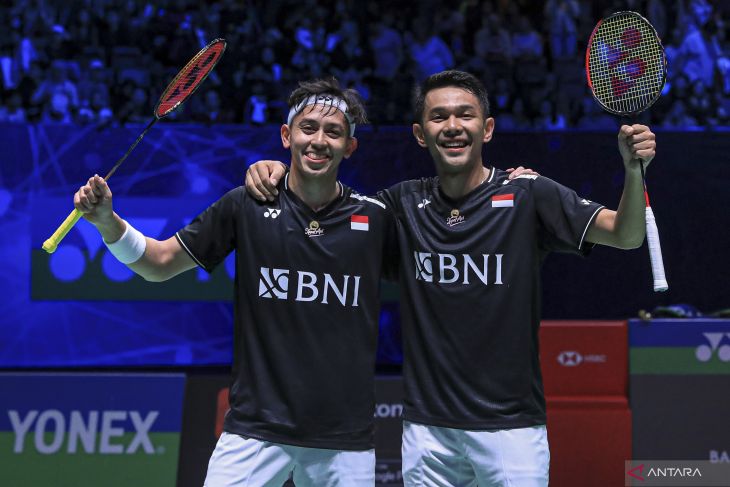 Pebulu tangkis ganda putra Indonesia Fajar Alfian (kanan) dan Muhammad Rian Ardian (kiri) berpose usai mengalahkan lawannya asal China He Ji Ting/Zhou Hao Dong dalam pertandingan semifinal All England 2023 di Utilita Arena Birmingham, Inggris, Minggu (19/3/2023). Ganda putra peringkat satu dunia tersebut melaju ke final usai mengalahkan He Ji Ting/Zhou Hao Dong dengan skor 21-19 dan 21-17. ANTARA FOTO/HO/Humas PBSI/mrh/hp.