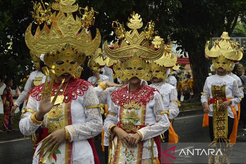 Peserta mengikuti karnaval topeng dalam Festival Krakatau 2023 di Jalan Sultan Agung, Bandar Lampung, Lampung, Sabtu (8/7/2023). Karnaval yang diikuti 3.000 pelajar dan mahasiswa se-kabupaten kota di Provinsi Lampung tersebut merupakan rangkaian dari Festival Krakatau 2023 yang menjadi kalender tahunan pariwisata Provinsi Lampung. ANTARA FOTO/Ardiansyah/nym.