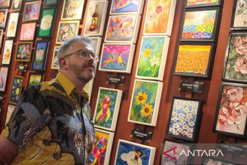 Wakil Konsul Jenderal Australia di Surabaya Anthony Clark mengamati lukisan yang dipajang dalam bursa lukisan pada Festival Seni Balai Pemuda di Surabaya, Jawa Timur, Jumat (6/10/2023). Sebanyak 432 lukisan karya 54 perupa dari berbagai daerah itu merupakan salah satu kegiatan seni dalam festival yang digelar hingga 15 Oktober 2023. ANTARA FOTO/Didik Suhartono/Spt.