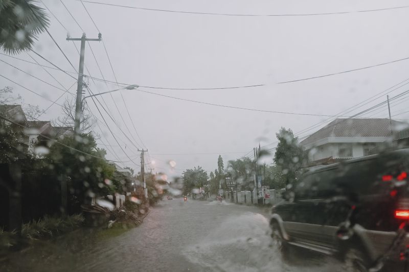 Palembang (ANTARA) – Sebuah kendaraan milik penghuni Perumahan Bukit Sejahtera (Poligon) di Ilir Barat I Kota Palembang melintasi jalan utama kompleks yang tergenang air akibat hujan deras yang turun merata di kota itu pada Kamis (15/2/2024) sore. (Antara/Syarif Abdullah)