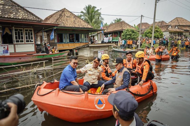 Sekayu, Muba (ANTARA) – Penjabat Gubernur Sumsel H Agus Fatoni dan Pj Bupati Musi Banyuasin Apriyadi Mahmud berperahu karet menyambangi warga yang terdampak banjir di Desa Tanjung Agung Barat Kecamatan Lais, Jumat (19/1/2024).