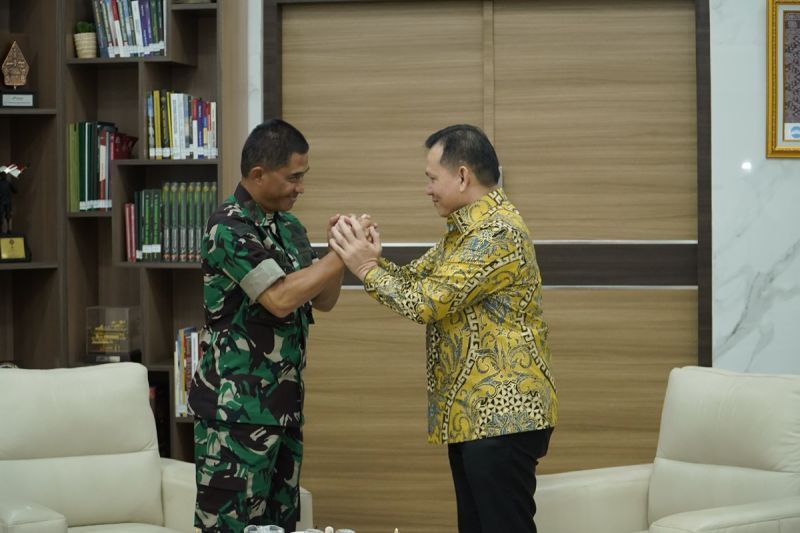 Penjabat (Pj) Gubernur Sumsel Elen Setiadi  bersilaturahmi bersama Pangdam II / Sriwjijaya Mayjen TNI M Naudi Nurdika pada hari pertama masuk kerja di Pemprov Sumsel,  Selasa,  (25/6/2024).