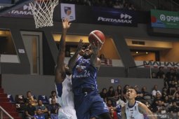 Pebasket Satria Muda Pertamina Jacobs Jr (kiri) berebut bola dengan pebasket Amartha Hangtuah Abraham Wenas (kanan) saat pertandingan seri ketiga IBL Pertamax 2020 di Britama Arena, Jakarta, Jumat (31/1/2020). Satria Muda …