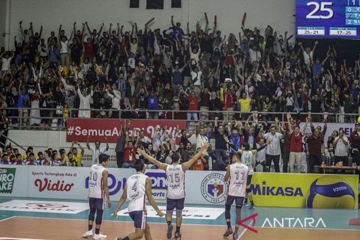 Pevoli Indonesia berselebrasi usai mengalahkan Thailand pada SEA V League putaran pertama di Padepokan Voli Jendral Kunarto, Sentul, Kabupaten Bogor, Jawa Barat, Minggu (23/7/2023). Indonesia juara putaran pertama SEA V League setelah mengalahkan Thailand dengan skor 3-1 (21-25, 25-17, 25-23, 27-25). ANTARA FOTO/Yulius Satria Wijaya/rwa.