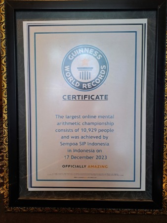 Hari ini Kamis, 18 Januari 2024, bertempat di Hotel JW Marriott, Kuningan Jakarta Selatan diadakan seremonial penyerahan sertifikat Guinness World Records yang diterima langsung oleh Founder Sempoa SIP Indonesia, Alexander K. Taslim dengan disaksikan oleh segenap pimpinan yang berasal dari provinsi Aceh, Sumatera Utara, Sumatera Barat, Riau, Kepulauan Riau, Jambi, Sumatera Selatan, Bengkulu, Lampung, DKI Jakarta, Jawa Barat, Jawa Tengah, DI Yogyakarta, Jawa Timur, Bali, Kalimantan Timur, Sulawesi Selatan, Sulawesi Utara dan Papua.