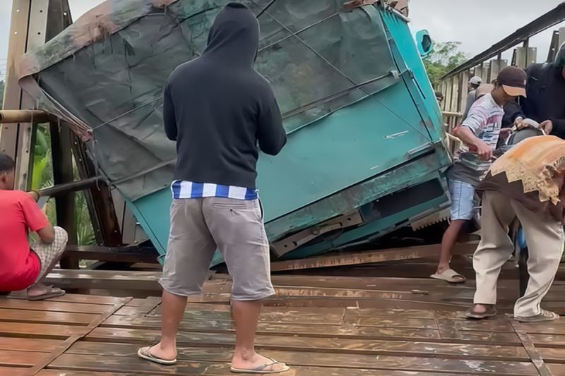 Selain itu, beban berat dari sebuah kendaraan besar yang melintas turut memicu jebolnya hamparan kayu jembatan itu. Warga mengevakuasi kendaraan yang terjebak di lokasi dan berusaha agar warga bisa tetap melintas.