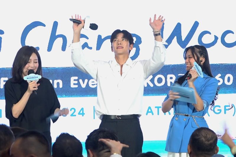 ANTARA – Aktor Korea Selatan Ji Chang Wook menyapa para penggemarnya di Jakarta, Minggu (12/5). Pada kunjungan ketiganya di Indonesia, pemain drama “Welcome to Samdal-ri” ini mengaku mulai cocok dengan Jakarta dan terpesona dengan Indonesia. (Suci Nurhaliza/Soni Namura/Ardi Irawan)