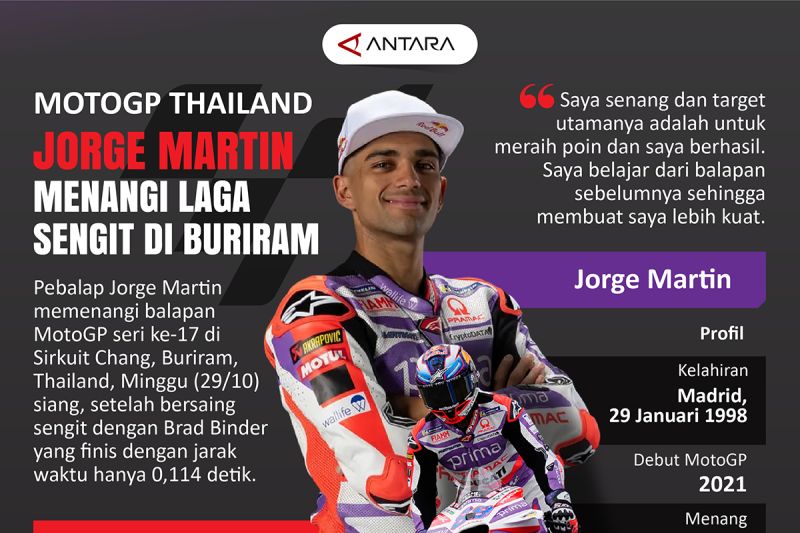 Pebalap Jorge Martin memenangi balapan MotoGP seri ke-17 di Sirkuit Chang, Buriram, Thailand, Minggu (29/10) siang, setelah bersaing sengit dengan Brad Binder yang finis dengan selisih waktu 0,114 detik.