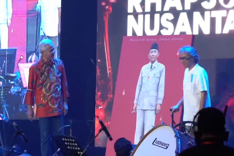 ANTARA – Gubernur Jawa Tengah, Ganjar Pranowo mendapatkan hadiah ulang tahun berupa lukisan bergambar mantan Presiden Sukarno, kala menghadiri peringatan Hari Sumpah Pemuda di Diamond Solo Convention Center, Jumat (28/10). Ganjar beroleh kado istimewa itu dari seniman serbabisa, Butet Kertarajasa, yang menjadi salah satu penampil dalam konser bertajuk “Rhapsody Nusantara 2022”. (Denik Apriyani/Soni Namura/Ahmad Faishal Adnan)