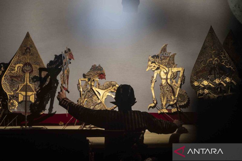 Dalang Ki Radyo Harsono mementaskan wayang kulit dengan lakon Wiratha Parwa di halaman Gereja Katedral, Jakarta, Sabtu (20/8/2022). Paroki Katedral Jakarta mengadakan pagelaran wayang kulit semalam suntuk tersebut dalam rangka perayaan 25 tahun tahbisan Uskup Ignatius Kardinal Suharyo dan HUT ke-77 Kemerdekaan RI. ANTARA FOTO/Aprillio Akbar/wsj.