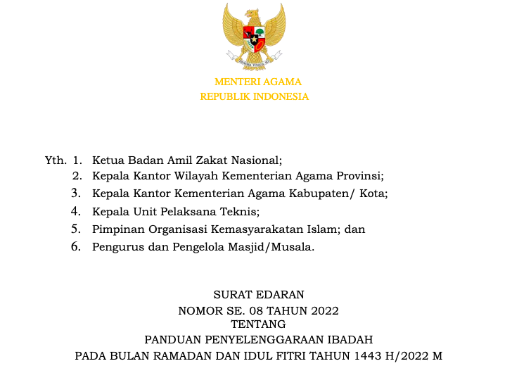 Menteri Agama (Menag) Yaqut Cholil Qoumas menerbitkan Surat Edaran (SE) Nomor SE. 08 Tahun 2022 tentang Panduan Penyelenggaraan Ibadah pada Bulan Ramadan dan Idulfitri 1443 H/2022 M. Aturan ini ditandatangani Yaqut pada 29 Maret 2022.