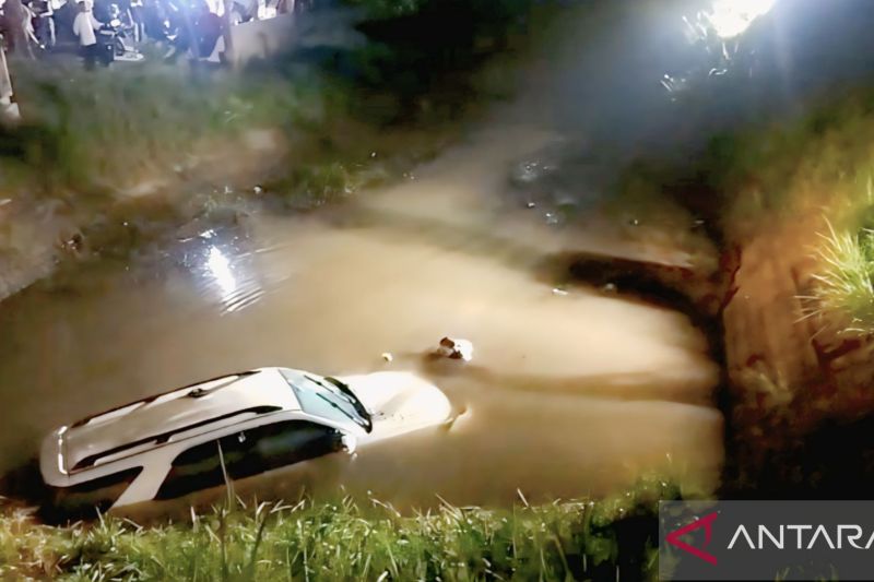 Satu unit mobil jenis Fortuner warna putih BG 1558 KA terjun ke peraiaran irigasi di Desa Tanjung Bulan, Kecamatan Buay Madang, OKU Timur, Sabtu. ANTARA/HO/Humas Polres OKU Timur