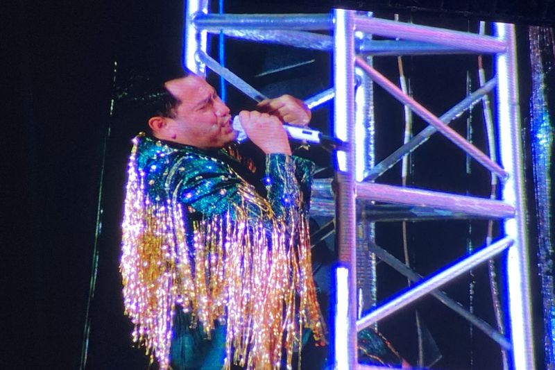 Ikon dangdut masa kini yang dikenal dengan sapaan akrab Oppa Nassar Kiyowo itu tampil mengenakan setelan jas dan celana pendek hijau penuh rumbai gemerlap berwarna emas.