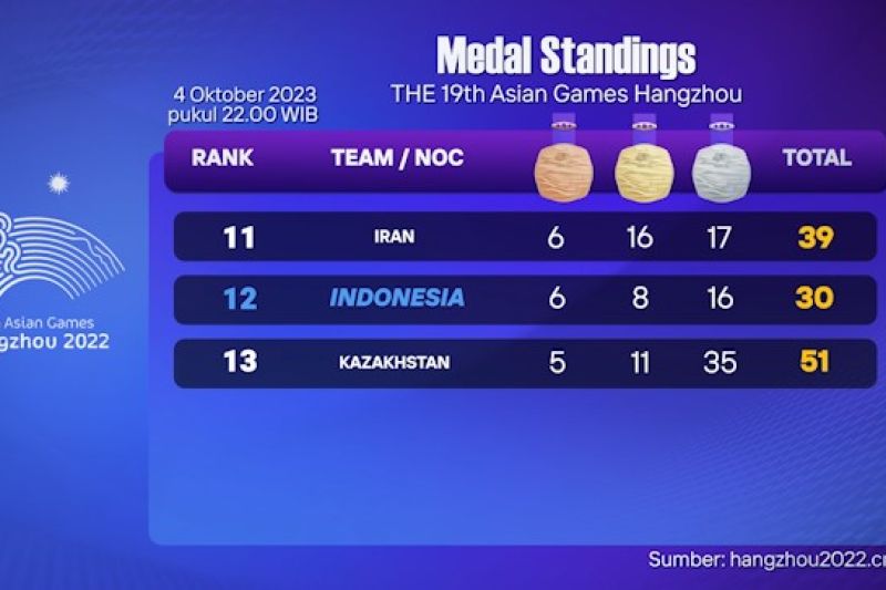 ANTARA – Hingga Rabu (4/10), pukul 22.00 WIB, kontingen Indonesia berada di urutan ke-12 klasemen sementara perolehan medali Asian Games Hangzhou 2022. Indonesia mendapat tambahan 3 perak dan 3 perunggu. (Anggah/Keysha Anissa/Rizky Bagus Dhermawan/Ludmila Yusufin Diah Nastiti)