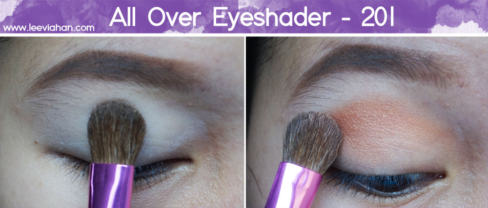 Difoto atas saya menggunakan All Over Eyeshader 201, untuk mengaplikasikan ke kelopak mata cuma enggak full sampai bawah, karena warna ini digunakan sebagai base transisi ke warna lain yang akan saya aplikasikan setelahnya.