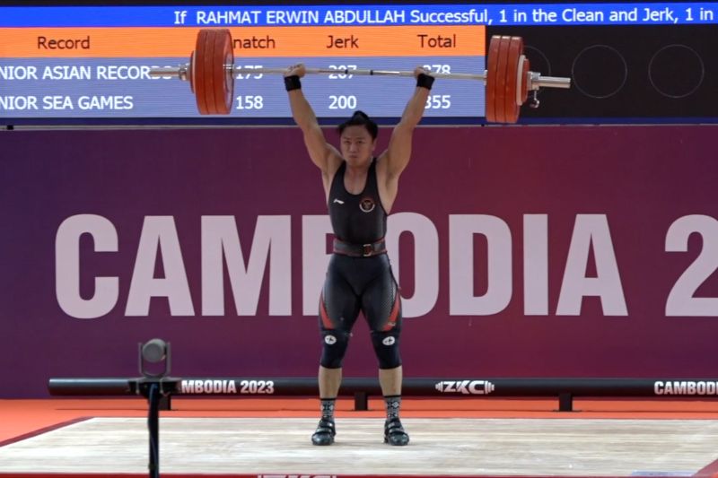 ANTARA – Indonesia kembali menambahkan koleksi medali emas SEA Games 2023 Kamboja, kali ini dipersembahkan oleh atlet angkat besi Rahmat Erwin Abdullah, di Olympic Taekwondo Hall, Phnom Penh, Senin (15/5). Rahmat bermain pada kelas 81 kilogram putra dan berhasil membukukan rekor SEA Games, yakni Snatch dan Clean and Jerk dengan total angkatan 359 kilogram. (Amita Putri Caesaria/Yovita Amalia/Gracia Simanjuntak)