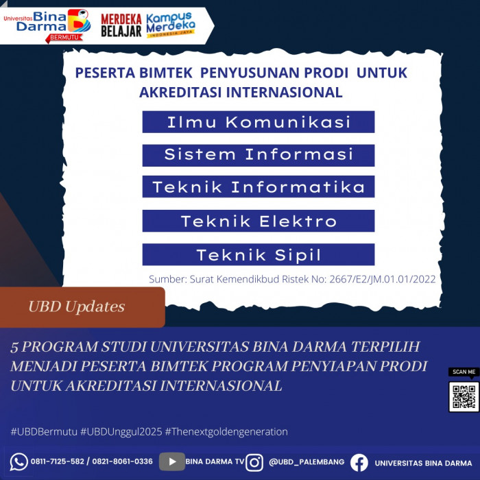 Diketahui, adapun lima prodi UBD yang akan menuju akreditasi internasional diantaranya Program Studi Sistem Informasi, Program Studi Teknik Informatika, Program Studi Teknik Sipil, Program Studi Teknik Elektro dan Program Studi Teknik Industri.