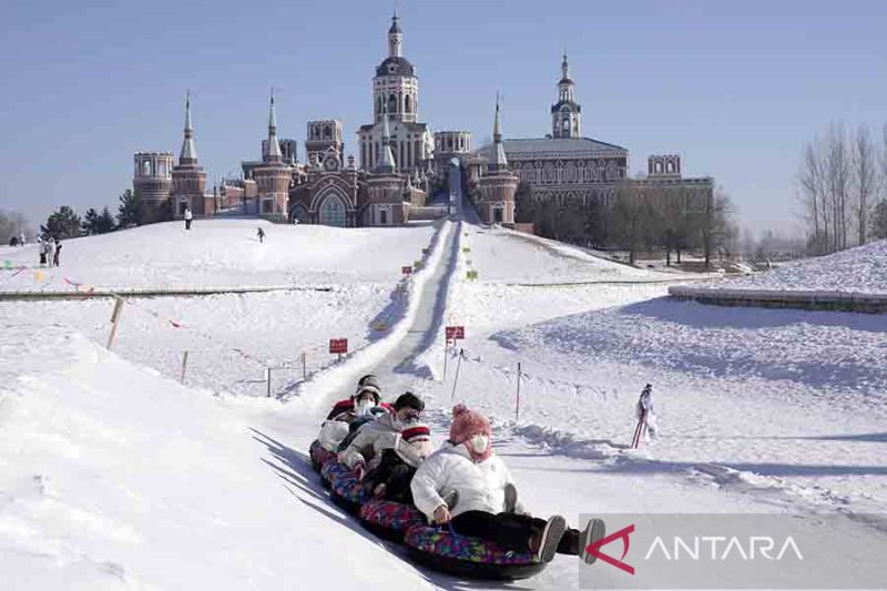 Pengunjung bermain di Volga Manor, Harbin, Provinsi Heilongjiang, China timur laut, Kamis (26/1/2023). Volga Manor, sebuah taman bertema budaya Rusia, yang diubah menjadi dunia es dan salju saat Festival Musim Semi menjadi wahana yang menarik banyak pengunjung. ANTARA FOTO/Xinhua/Wang Jianwei/rwa.
