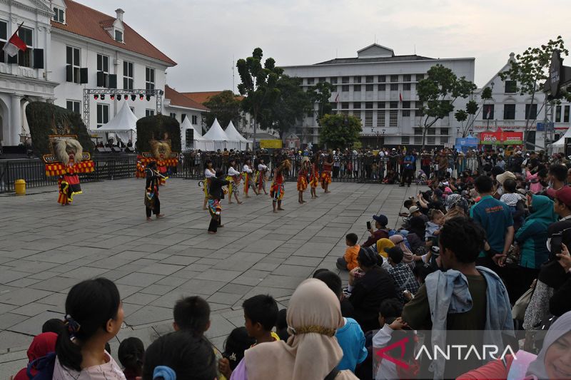 Sejumlah seniman Tari Reog Ponorogo beratraksi di arena Festival Batavia Kota Tua di Jakarta, Jumat (26/8/2022). Festival yang berlangsung hingga Minggu (28/8) tersebut menampilkan sejumlah kesenian tradisional maupun modern dan memamerkan sejumlah produk UMKM di Jakarta sekaligus sebagai momentum diresmikannya wajah baru Kota Tua setelah direvitalisasi. ANTARA FOTO/Aditya Pradana Putra/rwa.