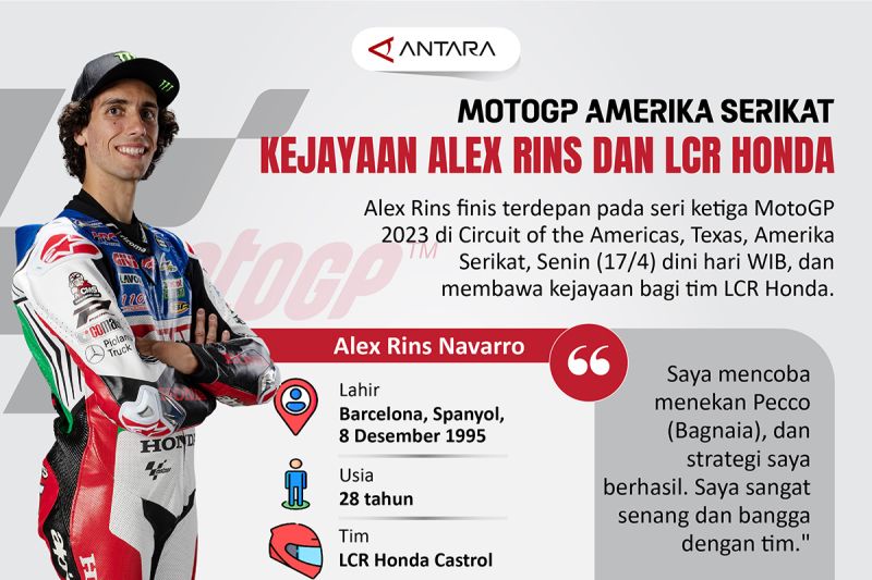 Alex Rins finis terdepan pada seri ketiga MotoGP 2023 di Circuit of the Americas, Texas, Amerika Serikat, Senin (17/4) dini hari WIB, dan membawa kejayaan bagi tim LCR Honda.