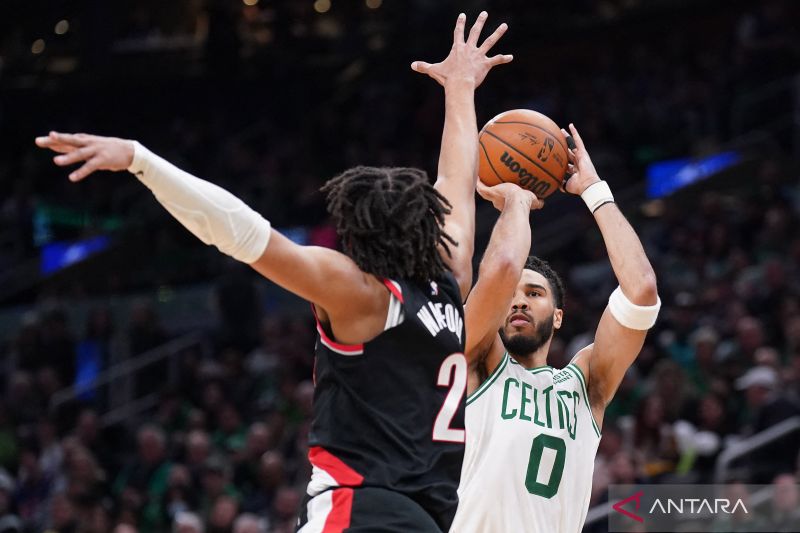 Pebola basket Boston Celtics Jayson Tatum (0) membidik tembakan dihalangi pemain Portland Trail Blazers Trendon Watford dalam laga NBA di TD Garden, Boston, Massachusetts, AS, Rabu (8/3/2023). Celtics menang dengan skor 115-93. ANTARA FOTO/Reuters/David Butler II-USA TODAY Sports/foc.