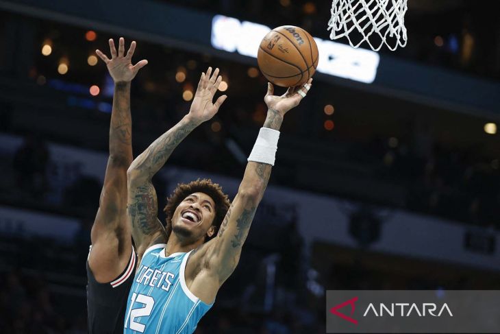 Pebasket Charlotte Hornets Kelly Oubre Jr. (12) memasukkan bola dengan dihalangi pebasket Los Angeles Clippers Ivica Zubac (40) pada pertandingan NBA di Spectrum Center Charlotte, North Carolina, AS (5/12/2022). ANTARA FOTO/Nell Redmond-USA TODAY Sports via Reuters/aww.