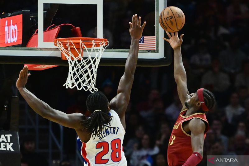 Pebasket Cleveland Cavaliers Caris LeVert (3) berupaya memasukkan bola ke keranjang dengan dihalangi pebasket Detroit Pistons Isaiah Stewart (28) dalam laga NBA di Rocket Mortgage FieldHouse, Cleveland, Ohio, AS (17/11/2023). Cleveland Cavaliers menang dengan skor 108-100. ANTARA FOTO/Ken Blaze-USA TODAY Sports via Reuters/tom.