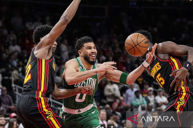 Pebasket Boston Celtics Jayson Tatum (0) berebut bola dengan pebasket Atlanta Hawks De’Andre Hunter (12) dalam pertandingan Playoffs NBA di State Farm Arena, Atlanta, Georgia, Amerika Serikat, Sabtu (22/4/2023). Atlanta Hawks menang atas Boston Celtics dengan skor 130-122. ANTARA FOTO/USA TODAY Sports via Reuters/Dale Zanine/nym.