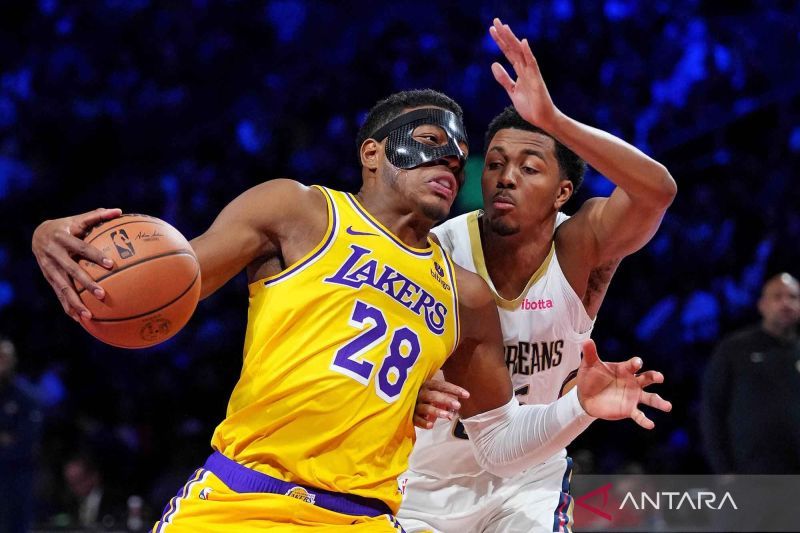 Pebasket Los Angeles Lakers Rui Hachimura (28) menggiring bola melawan pebasket New Orleans Pelicans Trey Murphy III (25) dalam pertandingan semifinal In Season Tournament NBA di T-Mobile Arena, Las Vegas, Nevada, Amerika Serikat, Jumat (8/12/2023). Los Angeles Lakers berhasil mengalahkan New Orleans Pelicans dengan skor 133-89 sehingga lolos ke final dan akan berhadapan dengan Indiana Pacers. ANTARA FOTO/USA TODAY Sports via Reuters/Kyle Terada/nym.