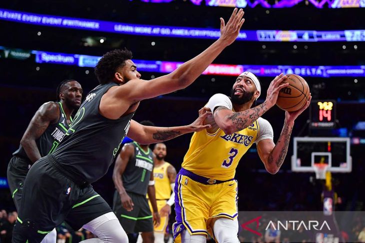Pebasket Los Angeles Lakers Anthony Davis (3) menggiring bola ke keranjang saat berhadapan dengan pebasket Minnesota Timberwolves Karl-Anthony Towns (32) dalam pertandingan play-in NBA di Crypto.com Arena Los Angeles, California, Amerika Serikat, Rabu (12/4/2023). Los Angeles Lakers berhasil mengalahkan Minnesota Timberwolves 108-102 sehingga memastikan diri ke putaran pertama play-off untuk menghadapi Memphis Grizzlies. ANTARA FOTO/USA TODAY Sports via Reuters/Gary A. Vasquez/nym.