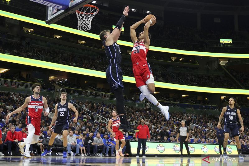 Pebola basket Orlando Magic Moritz Wagner (21) mencoba memblok usaha pemain Washington Wizards Landry Shamet (20) mencetak skor saat laga NBA di Amway Center, Orlando, Florida, AS, Jumat (1/12/2023). Magic menang dengan skor 130-125. ANTARA FOTO/USA TODAY Sports via Reuters Con/Nathan Ray Seebeck/foc.